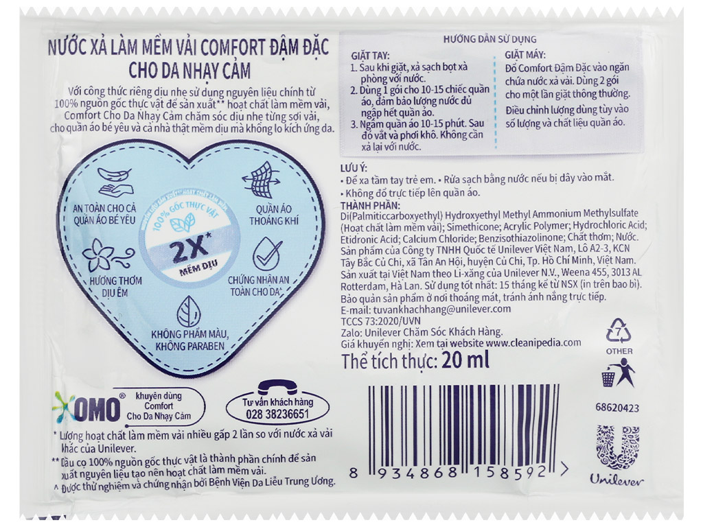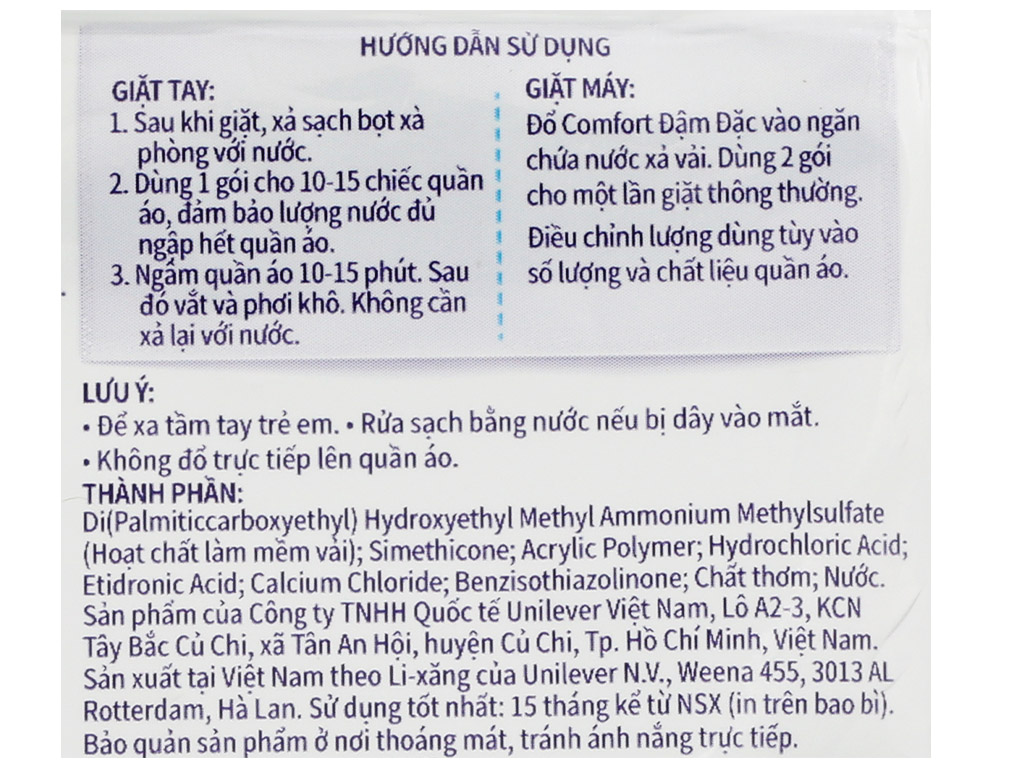 About the Comfort brand: Comfort is a renowned brand specializing in laundry detergents and fabric softeners, belonging to Unilever – a globally recognized corporation. With its distinctive fragrance and excellent quality, Comfort is increasingly establishing its position and standing in the market. Currently, the brand is available at retail outlets nationwide, providing excellent support in clothing care.