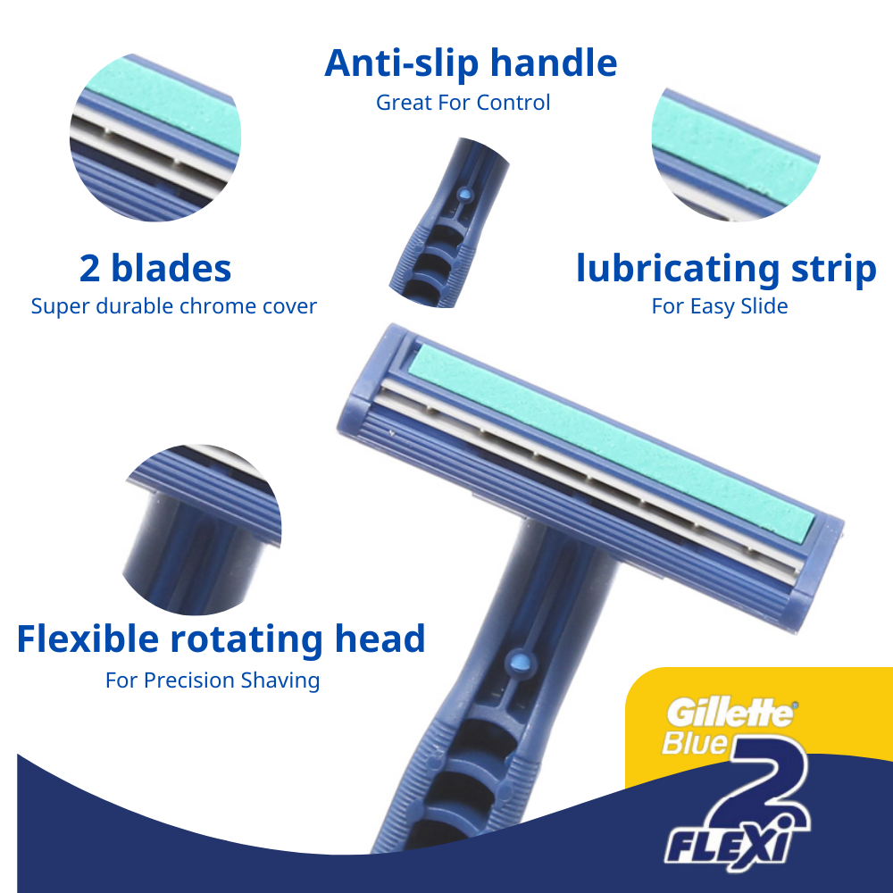 Gillette Blue 2 Flexi is a disposable razor set for men with flexible shaving heads that adapt to the structure of each face.