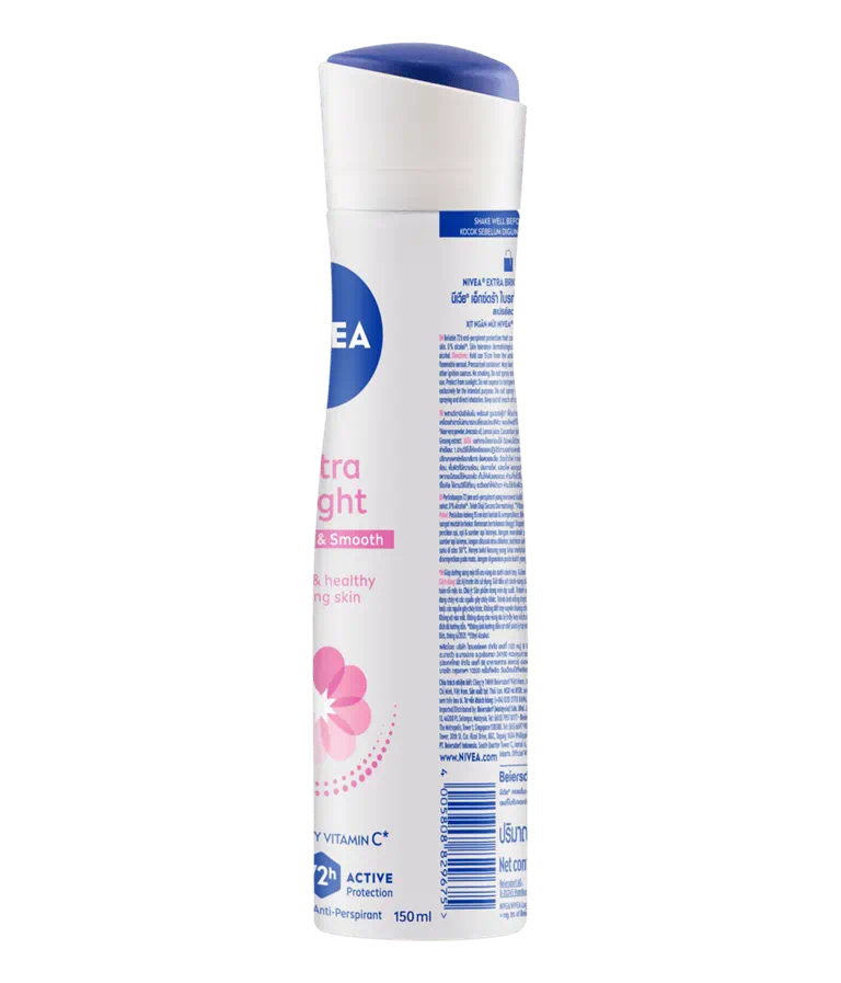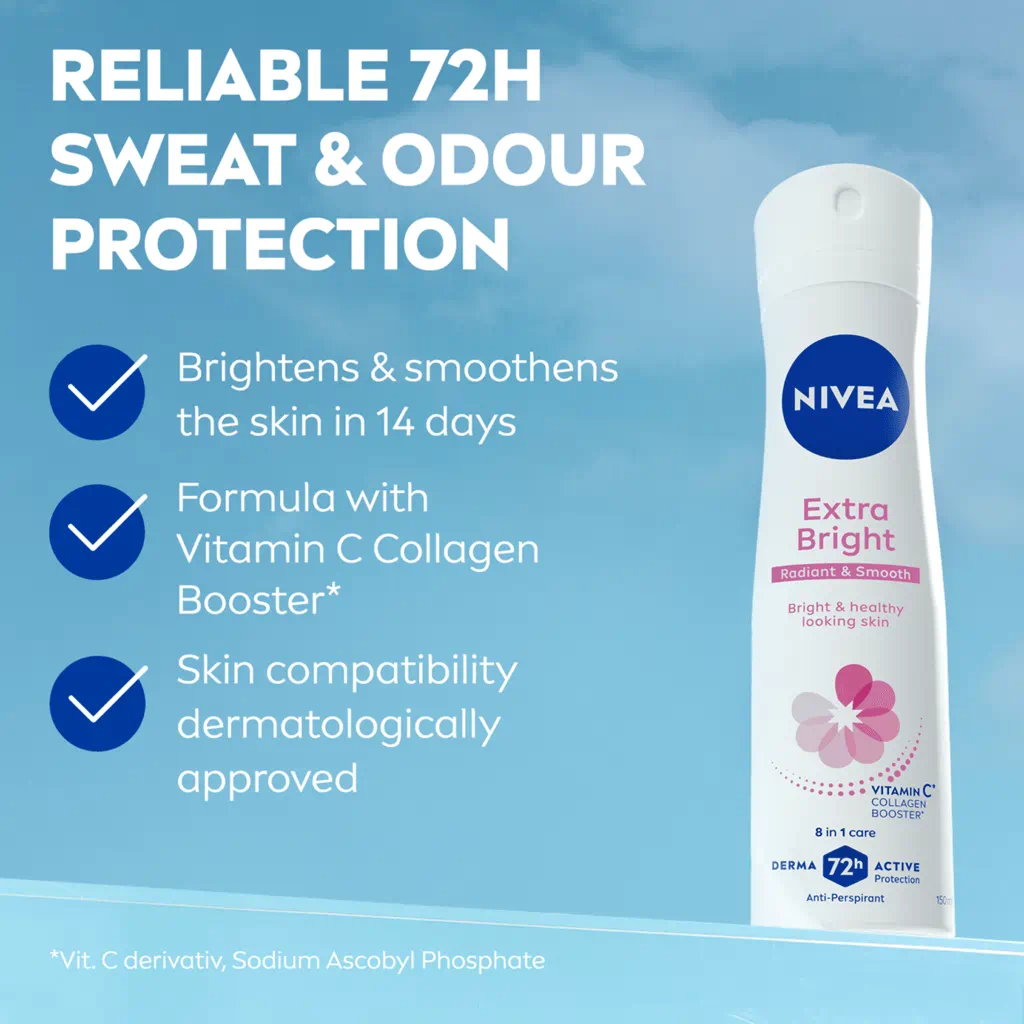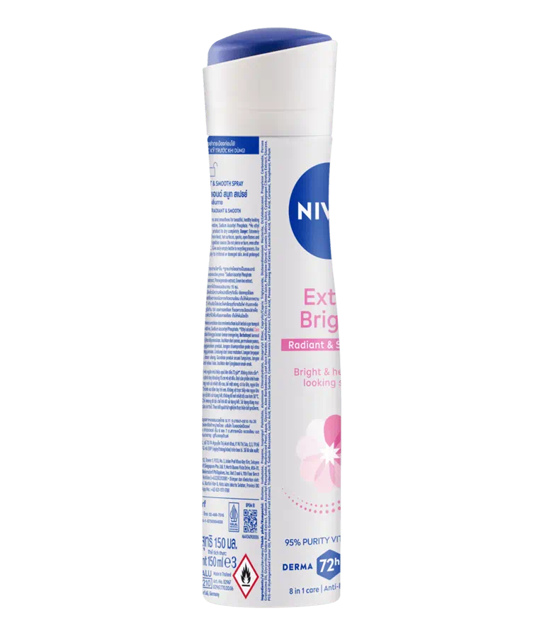 NIVEA Extra Bright Radiant & Smooth Deodorant Spray provides reliable 72h anti-perspirant protection that cares for your skin. It brightens and smoothens for beautiful, healthy looking skin in 14 days.