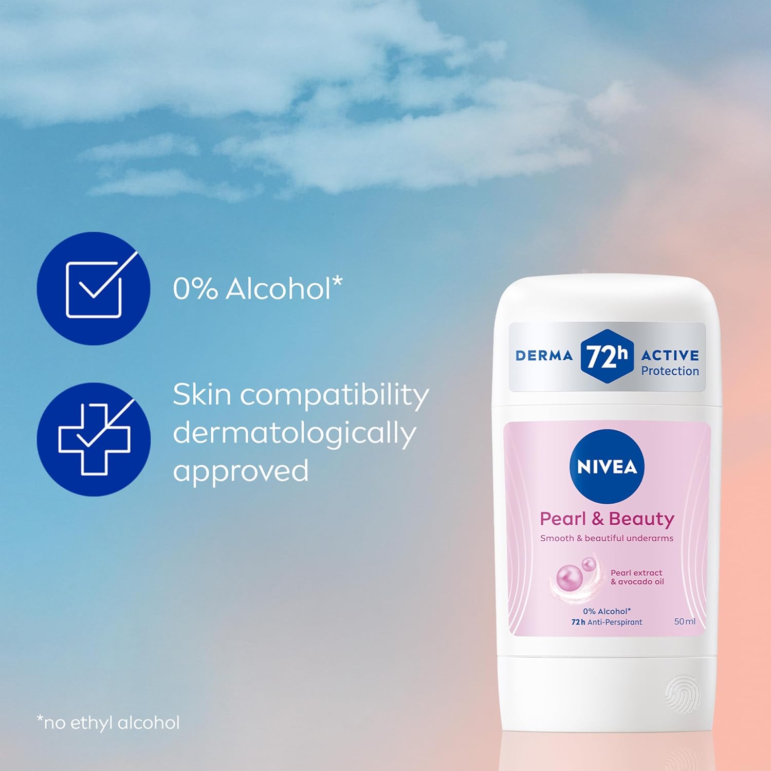 With its new patented emulsion technology, NIVEA Pearl & Beauty Anti-Perspirant Stick offers 48h realiable protection and a smooth application. Experience an extra fresh and non-sticky skin feel. The dermatogolically-proven and ethyl alcohol-free formula is gentle to your skin. It contains pearl extraxt. For smooth & beautiful underarms. Discover the new and modern packaging which was designed for a more intuitive user experience. It offers 25% more content and saves 30% plastic (*per ml compared to the previous NIVEA Deo stick packaging). The NIVEA Pearl & Beauty Anti-Perspirant Stick is a 100% climate neutralized product. **Remaining CO2 emissions are balanced out through certified climate projects. More on Nivea.com/climate