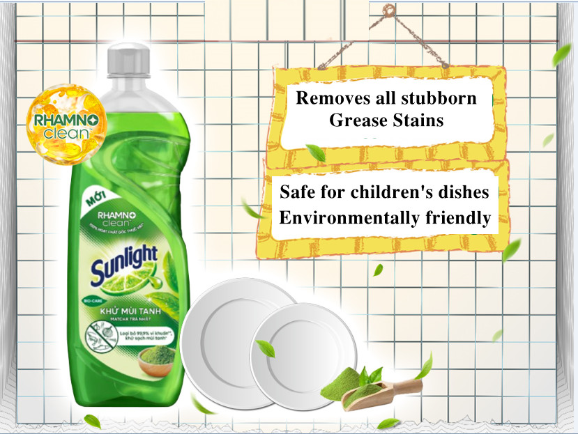 - With double the green tea extract combined with lemon juice, the new Sunlight green tea is effective on plastic dishes, removing stubborn grease stains, leaving dishes sparkling clean.