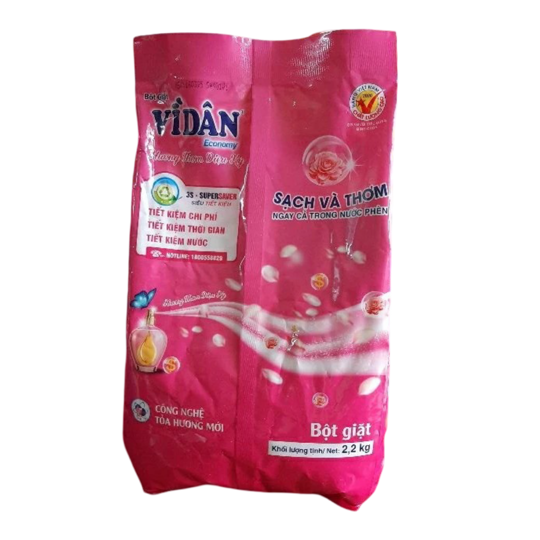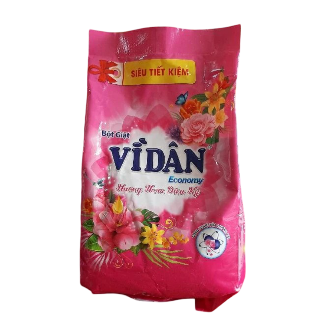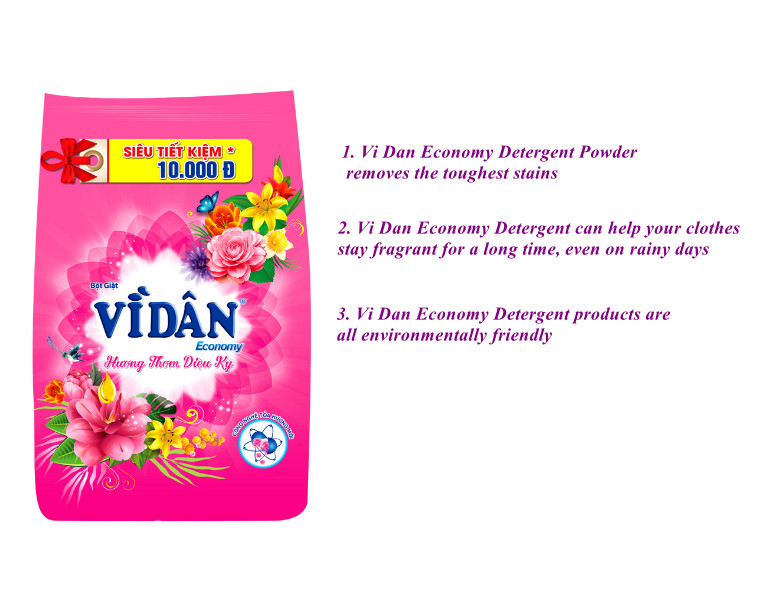 - With Vi Dan Economy Detergent Powder, you can start a dynamic and refreshing day by wearing the fresh fragrance of countless natural floral essences. Moreover, rainy days will no longer be a concern as Vi Dan Economy Detergent Powder can help your clothes stay fragrant for a long time, even on rainy days.