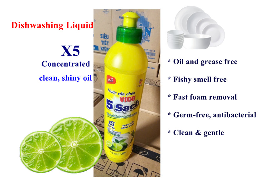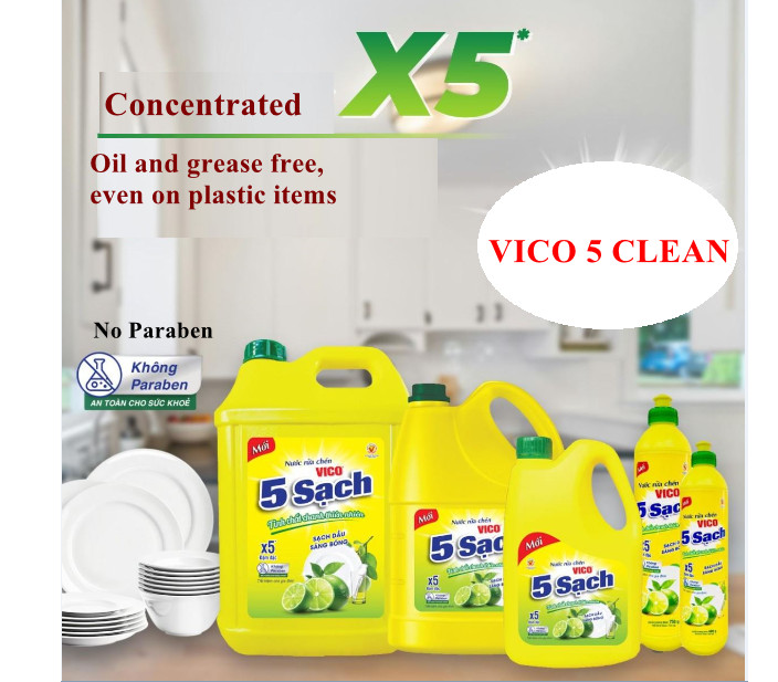 VICO 5 CLEAN is made from natural lemon extract with a special formula that cleans tough stains on glasses, bowls, and plates effectively with just a small amount of dishwashing liquid. - Eliminates 5 Unpleasant Odors